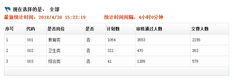 截止4月30日15:23,2018石家庄市事业单位考试审核通过5412人,交费人数2998人。其中,教育岗审核通过3653人,交费2156人;卫生岗审核通过470人,交费人数263人;综合岗位审核通过1289人,交费人数579人。